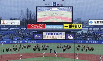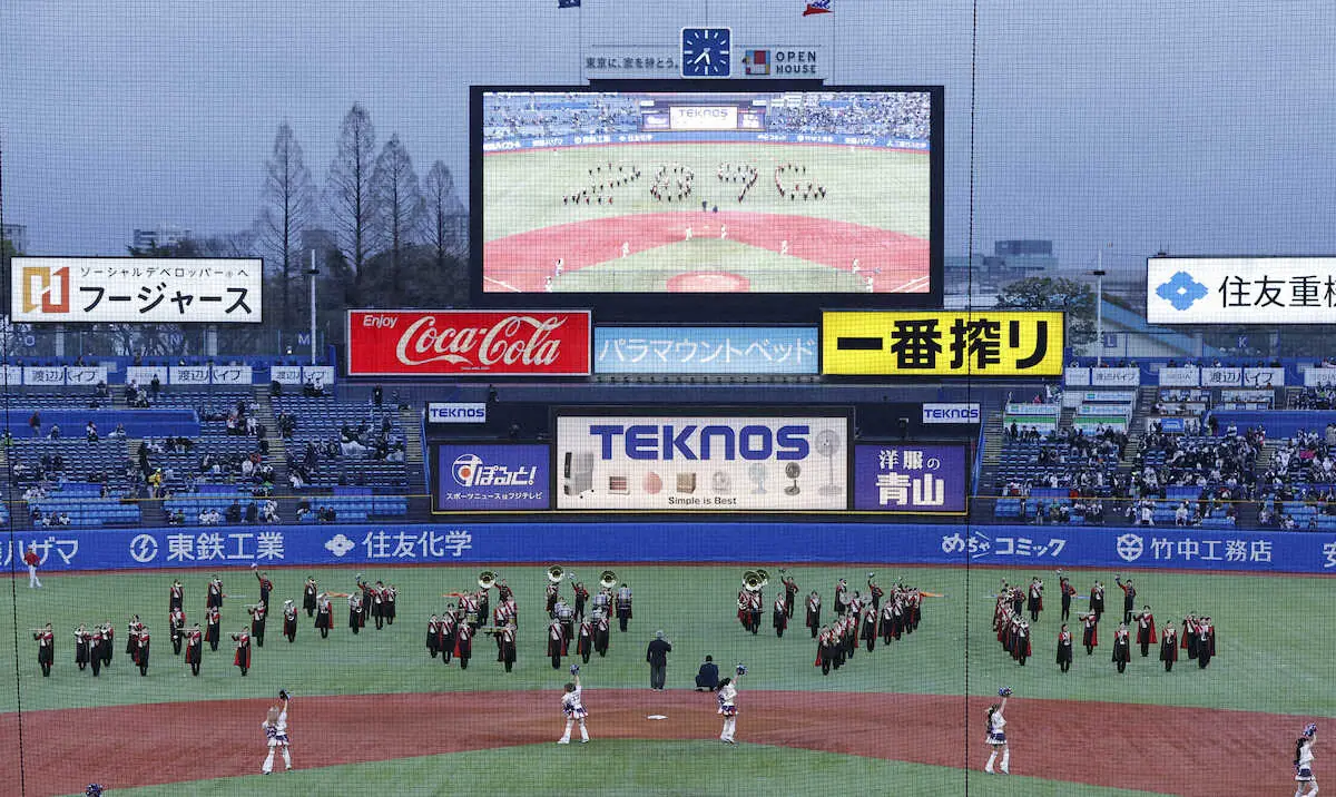 ヤクルトの本拠地開幕戦セレモニーで、国歌を演奏した東海大高輪台高吹奏楽部が活動休止中の球団公式マスコット・つば九郎をもじった「2896」の人文字をつくって盛り上げた。