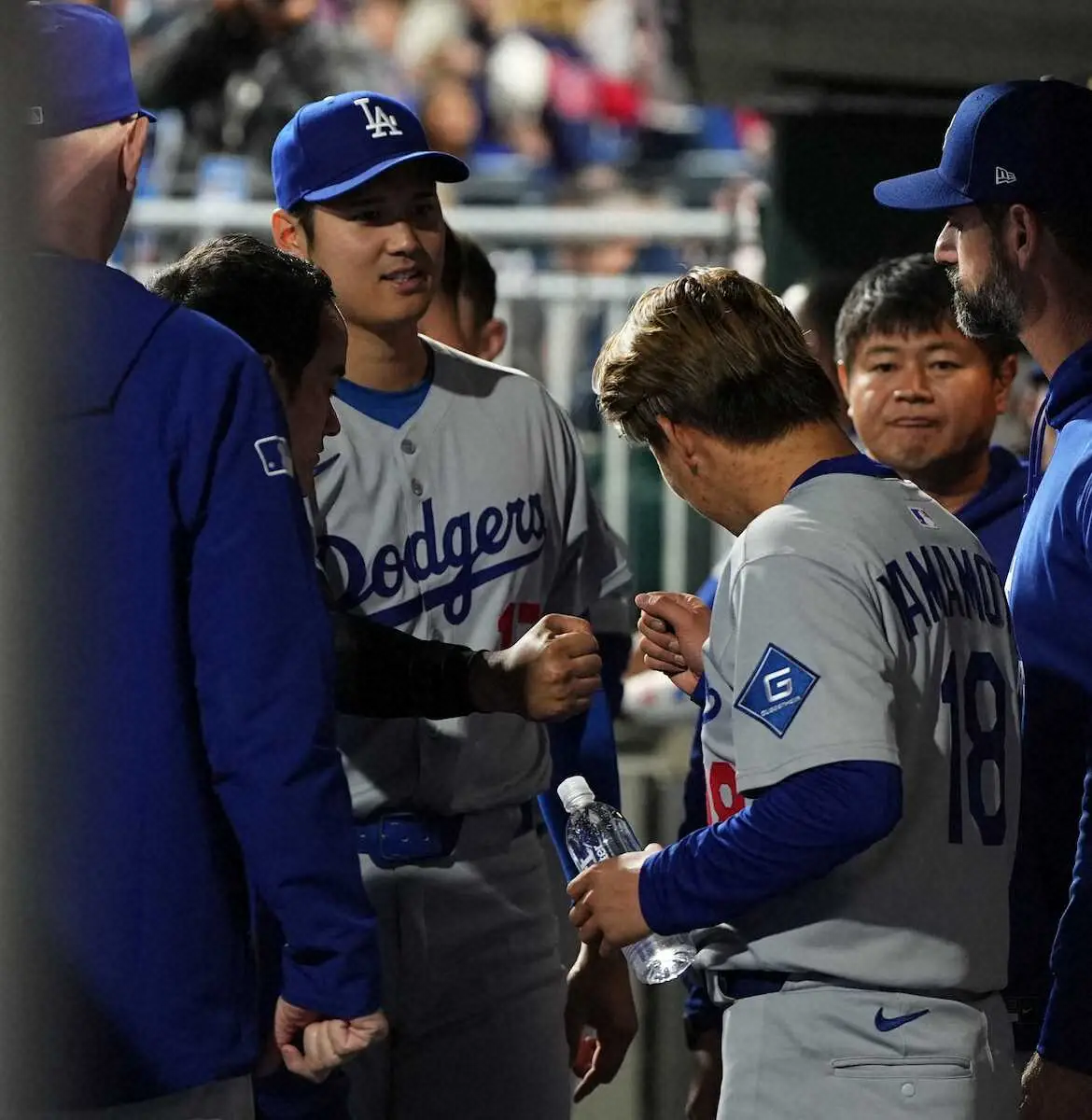 <フィリーズ・ドジャース>6回1失点で降板した山本に声をかける大谷(撮影・沢田 明徳)