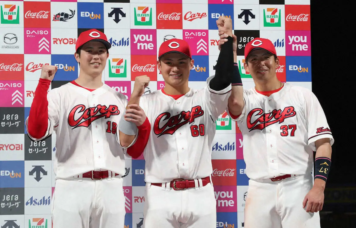 <広・D>お立ち台に立った広島の(左から)森下、田村、野間(撮影・奥 調)