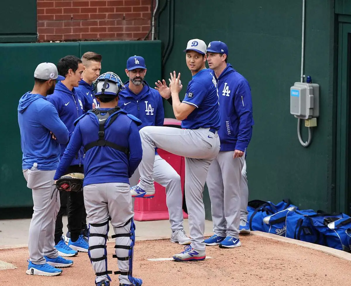 ドジャースの大谷翔平投手(30)が5日(日本時間6日)、敵地でのフィリーズ戦の試合前にブルペンで26球の投球練習を行った。