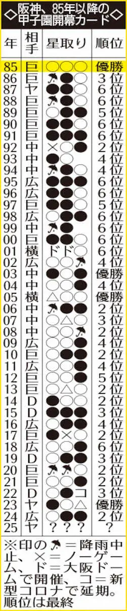 注目は「3連戦全勝」。23年4月4日付の本紙大阪本社版の当欄でも「アレ(優勝)よりレア」として紹介しているが、阪神の本拠地開幕カード3連戦全勝は85年の巨人戦を最後に39年間なし。2番目に遠ざかっている日本ハムでも最新の達成は02年で今世紀の記録。屋外球場ゆえ降雨中止など天候にも達成を左右されるが、それでも過去の3戦全勝は56年広島戦、76年ヤクルト戦と前出の85年巨人戦の3度だけ。阪神のセ・リーグ優勝6度(62、64、85、03、05、23年)より少ない。