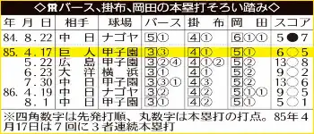 関連して“ドラ1クリーンアップ”佐藤輝、森下、大山の「初めて」にも期待したい。前回3戦全勝した85年巨人戦の2戦目(4月17日)は、7回に3番のランディ・バース、4番の掛布雅之、5番の岡田彰布による“バックスクリーン3連発”が出た試合でもある。実はこれが3人による初のクリーンアップ本塁打そろい踏み(別打順含む同一試合は2度目)で、以降同年4度、86年2度の計6度すべてでチームを勝利に導いた。一方で佐藤輝、森下、大山はクリーンアップで16度の打点そろい踏みはあれど、本塁打は別打順を含めて未経験。トリオ結成3年目、球団創設90周年の甲子園で実現となるか――。注目だ。 (記録担当・桐山 章)