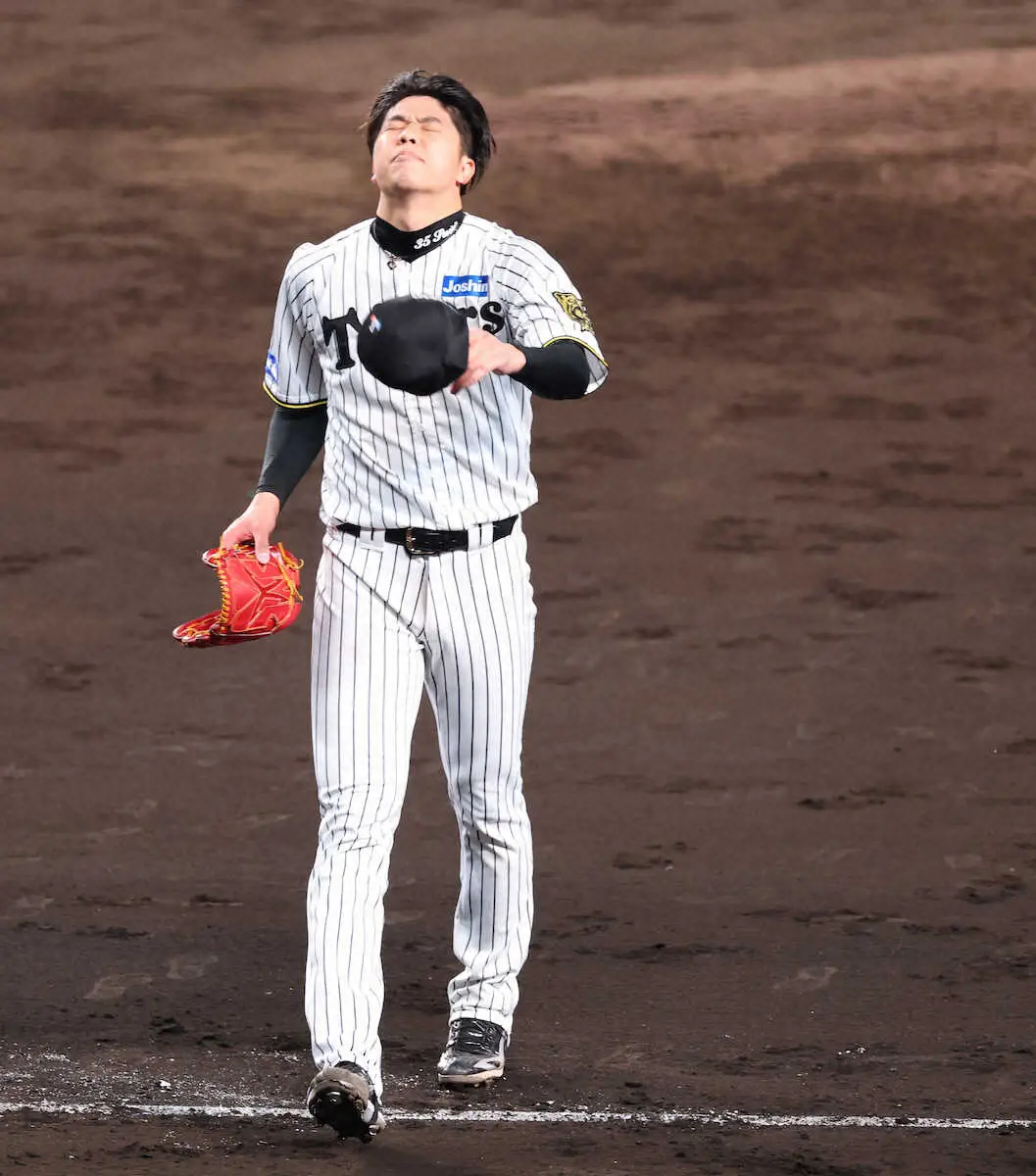 <神・ヤ(1)> 8回に先制点を許し、悔しさをにじませる才木 (撮影・後藤 大輝)