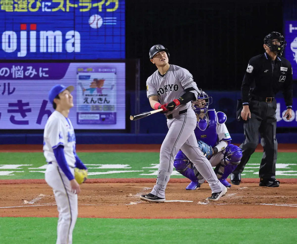 10年後。成長の詰まった先制3号ソロで、長嶋氏の開幕11試合連続安打記録に並んだ。「打つべきところを打った。普通にやるべきことをやっている」