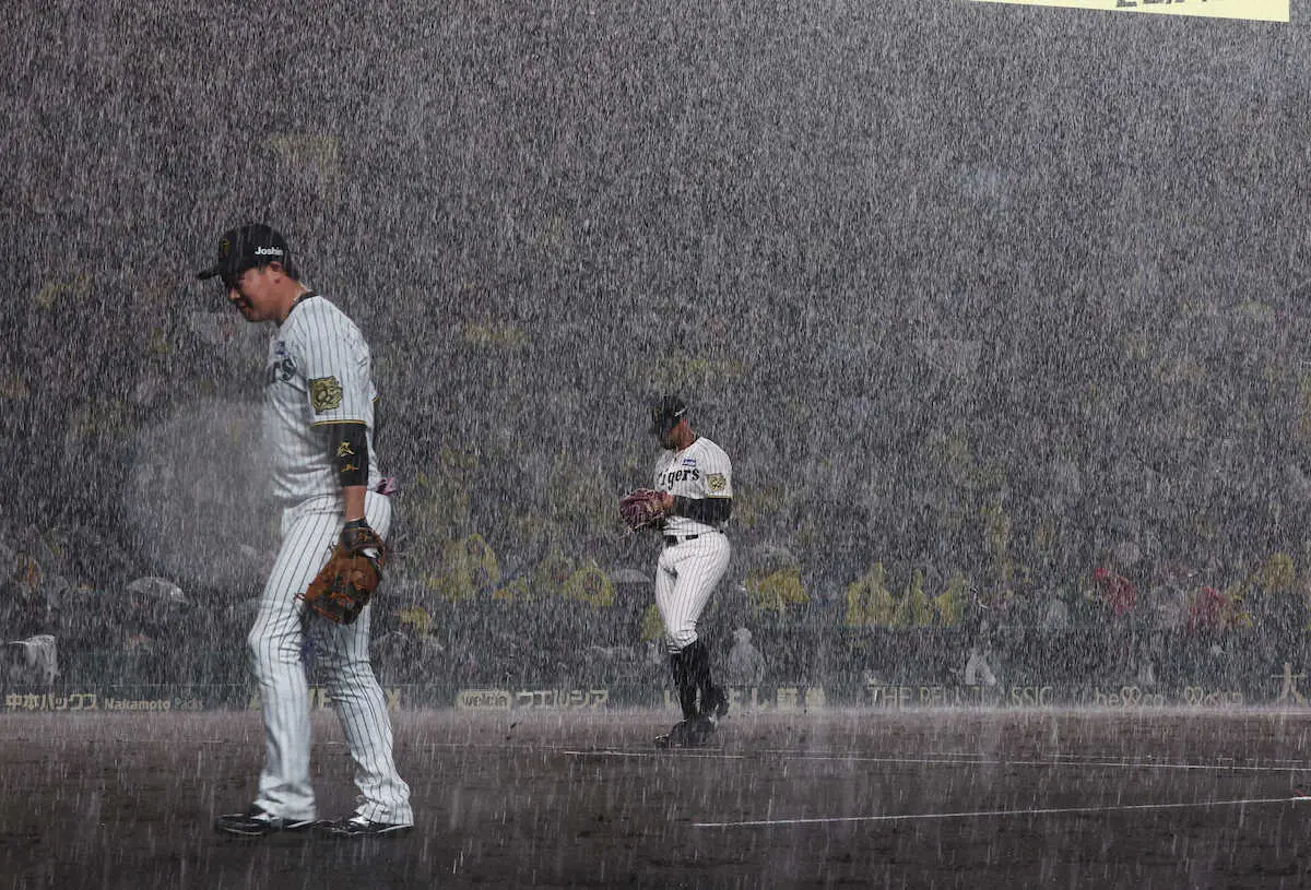 <神・ヤ(3)>3回、試合再開と思われたが、再び雨脚が強まりベンチへ避難すデュプランティエ(右)ら(撮影・大森 寛明)