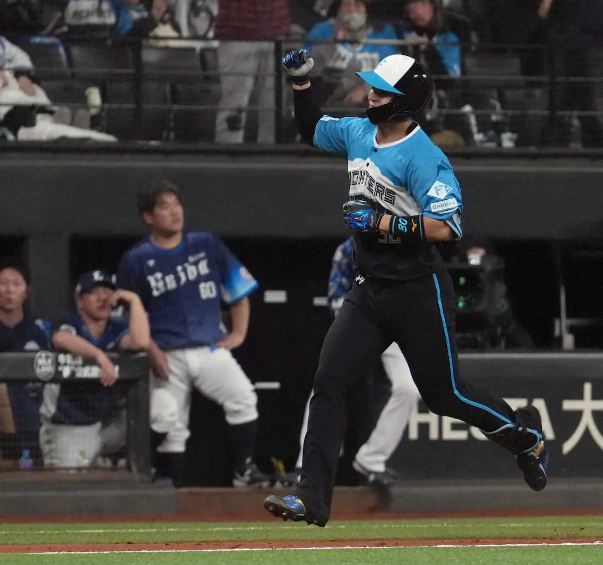 <日・西>12回、代打サヨナラ2ランを放った郡司を出迎える新庄監督(撮影・高橋 茂夫)