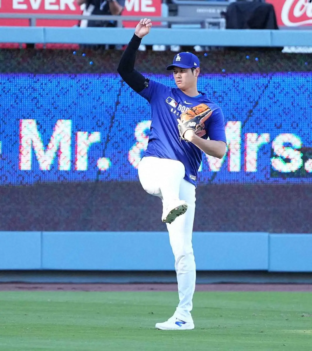 大谷は試合前練習でキャッチボールを行い、左翼ポール際のファンにボールを投げ込みプレゼント。そして、中堅方向へ向き直ると、外野にいた鈴木に向かって釣り竿を投じるようなポーズを見せ、鈴木を“招集”した。