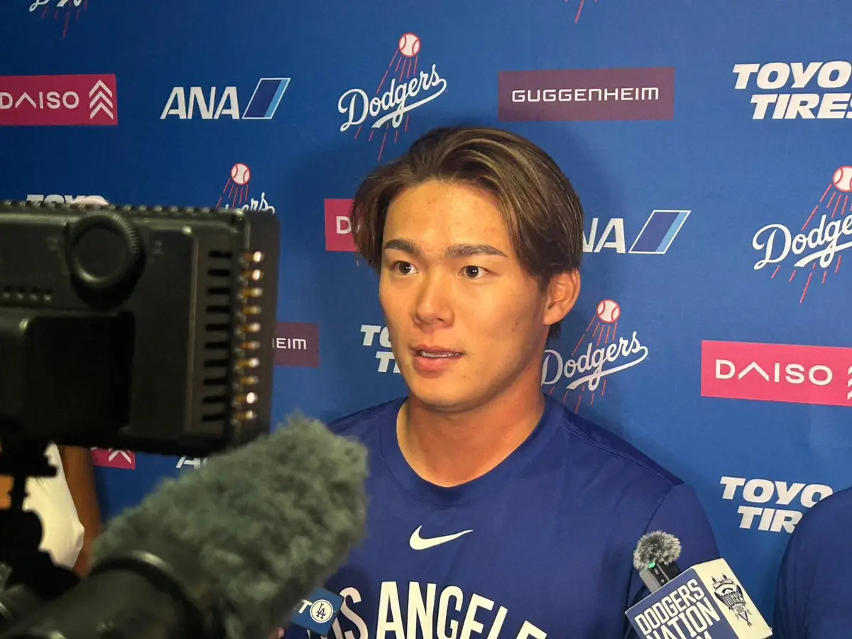 試合後、取材に応じるドジャース・山本(撮影・柳原 直之)