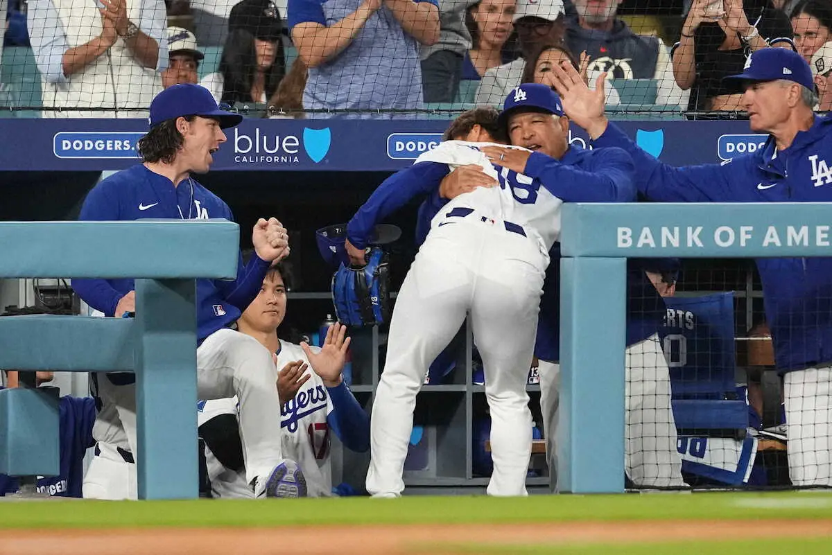 <ドジャース・カブス>6回無失点と好投のドジャース先発・山本を出迎える大谷とロバーツ監督(撮影・沢田 明徳)