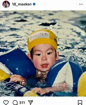 そして「Never give up 頑張ります!まだまだ若いよー!笑 おめでとうメッセージよろしくお願いします。笑」と続け、「なんか誕生日っぽい写真がなくてこれになりました」と「まえだけんた」とひらがなで書かれた帽子をかぶりプールで泳ぐ自身の幼少期の写真を投稿した。