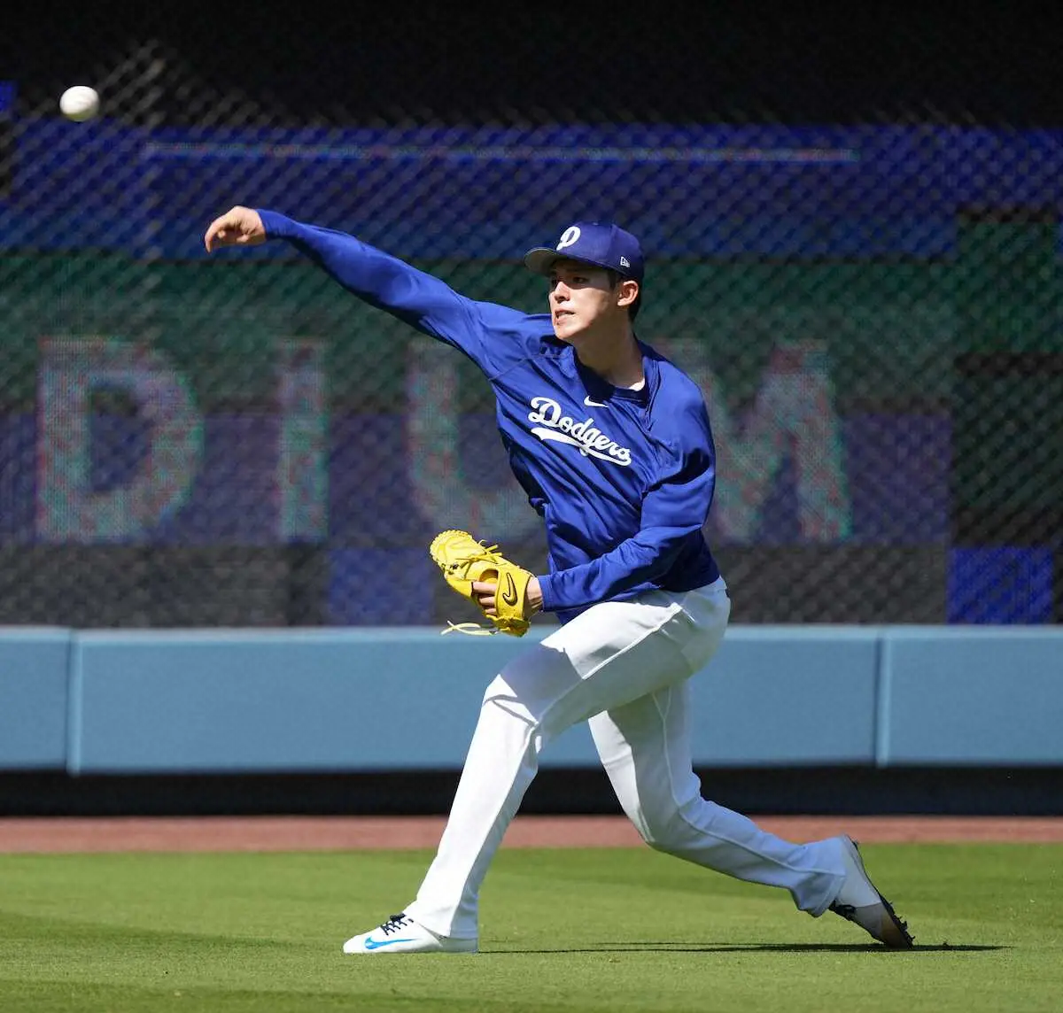 <ドジャース・カブス>試合前、キャッチボールする佐々木(撮影・沢田 明徳)