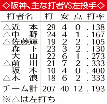 今季の猛虎は、不思議とサウスポーに手こずっている。左腕が先発時はこれで2勝5敗。特に、佐藤輝と森下の苦戦が目立つ。右投手に打率・250の佐藤輝は対左が・105(19打数2安打1本塁打)。右には・321と強い森下は、左腕に・130(23打数3安打1本塁打)と実力を発揮できていない。チームとしては、ヤクルト・石川にも勝ち星を献上したように、技巧派の左投手を攻略できない試合が続く。