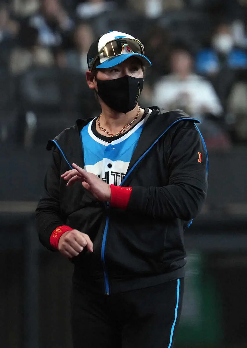 <日・西>8回、投手交代を告げベンチに下がる新庄監督(撮影・高橋 茂夫)
