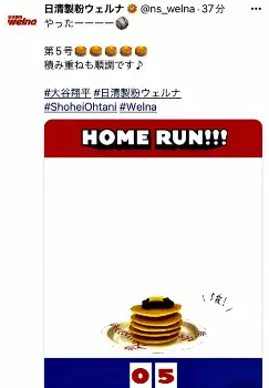 大谷がCMに出演している日清製粉グループの「日清製粉ウェルナ」も公式X(旧ツイッター)で6試合ぶりの5号に大喜び。今季から大谷が本塁打を放った際にホットケーキ1枚=1本でホームランカウンターを開始しており「第5号 積み重ねも順調です」と5枚まで積み上げられたホットケーキの画像を投稿した。