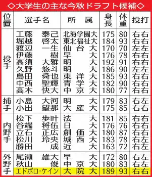 ◇エドポロ・ケイン 2003年(平15)7月2日生まれ、大阪市出身の21歳。小2からナガセボーイズで野球を始めて外野手を務める。小4からは大阪生野リトルリーグ、中学からは南大阪ベースボールクラブに所属。日本航空(山梨)では2年秋から背番号9でベンチ入りし、3年夏の甲子園で3回戦進出。大院大ではリーグ戦に1年春から出場し、通算8本塁打。50メートル走6秒1、遠投120メートル。1メートル89、93キロ。右投げ右打ち。