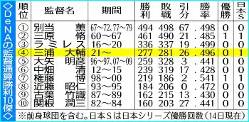 翌22年は73勝68敗2分け(・518)、23年は74勝66敗3分け(・529)、24年は71勝69敗3分け(・507)と3年連続でシーズン勝率5割をクリアし、着実に借金を返済している。前身を含めて球団歴代監督の通算勝利10傑を見ると、1位は別当監督の494勝で、三浦監督はラミレス監督の336勝に次いで単独4位。この中で勝率5割超えは、7位の権藤監督(・541)だけ。同球団の監督にとって高いハードルになっている。