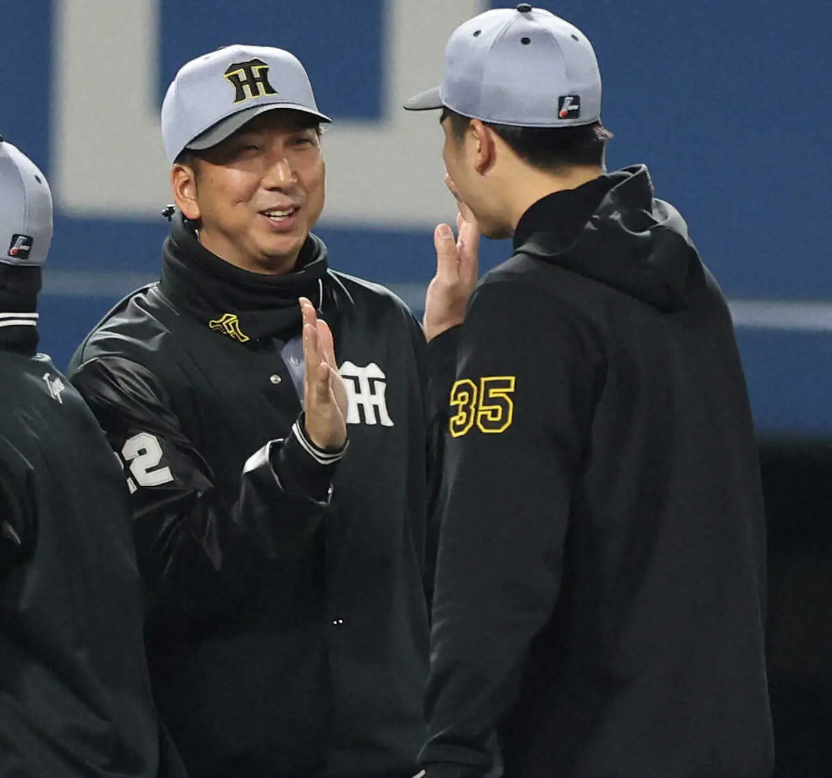 <ヤ・神>才木(右)とタッチを交わす藤川監督(撮影・須田 麻祐子)