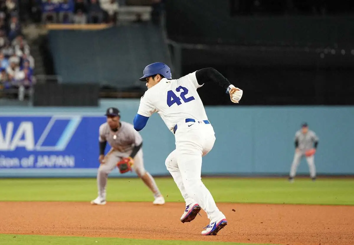 この日は黒人初のメジャーリーガーの功績を称える「ジャッキー・ロビンソン・デー」で、試合前には大谷、山本らもセレモニーに参加。全球団の選手が背番号42を着用し、大谷も「42」のユニホームでプレーした。