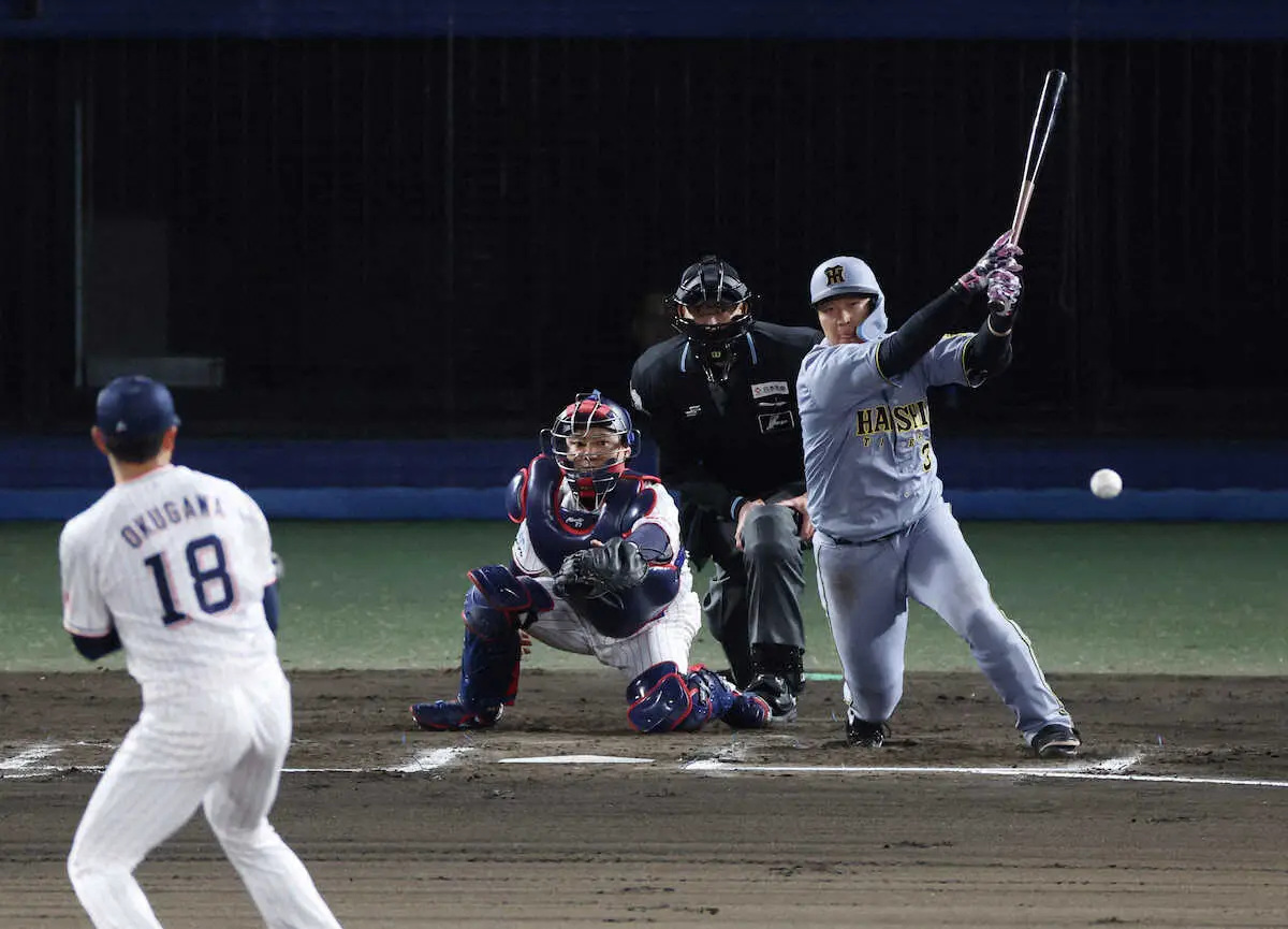 阪神・大山が5番としての役割を果たした。6回1死三塁。先発・奥川の外角フォークを強振すると、飛びついた遊撃手・長岡のグラブをはじく中前適時打を放った。松山では18年4月24日のヤクルト戦でもタイムリーを記録。通算でも10打数3安打3打点だ。