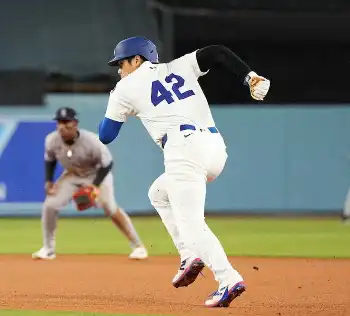 大リーグ初の黒人選手として人種差別の壁を打ち破ったロビンソンが、47年にドジャースでデビューした日を記念する「ジャッキー・ロビンソン・デー」を迎え、全球団の選手がロビンソンの背番号「42」でプレーした。通算197盗塁のロビンソンも盗塁王2度、首位打者1度の走攻守そろったオールラウンドプレーヤー。二刀流として、ド軍の大先輩からパイオニアの系譜を受け継ぐ大谷が、特別な一日に節目に達した意義も大きい。