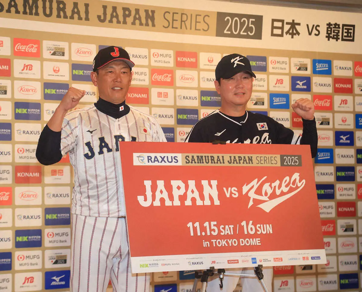 日本野球機構(NPB)と侍ジャパンを運営するNPBエンタープライズは、11月15、16日に韓国代表と東京ドームで強化試合を行うと17日に発表し、記者会見を行った。「ラグザス侍ジャパンシリーズ2025 日本VS韓国」として開催される。会見にはNPBの榊原定征コミッショナー、侍ジャパン・井端弘和監督、韓国野球委員会の許亀淵(ホ・グヨン)コミッショナー、韓国・柳志炫(リュ・ジヒョン)監督が出席した。