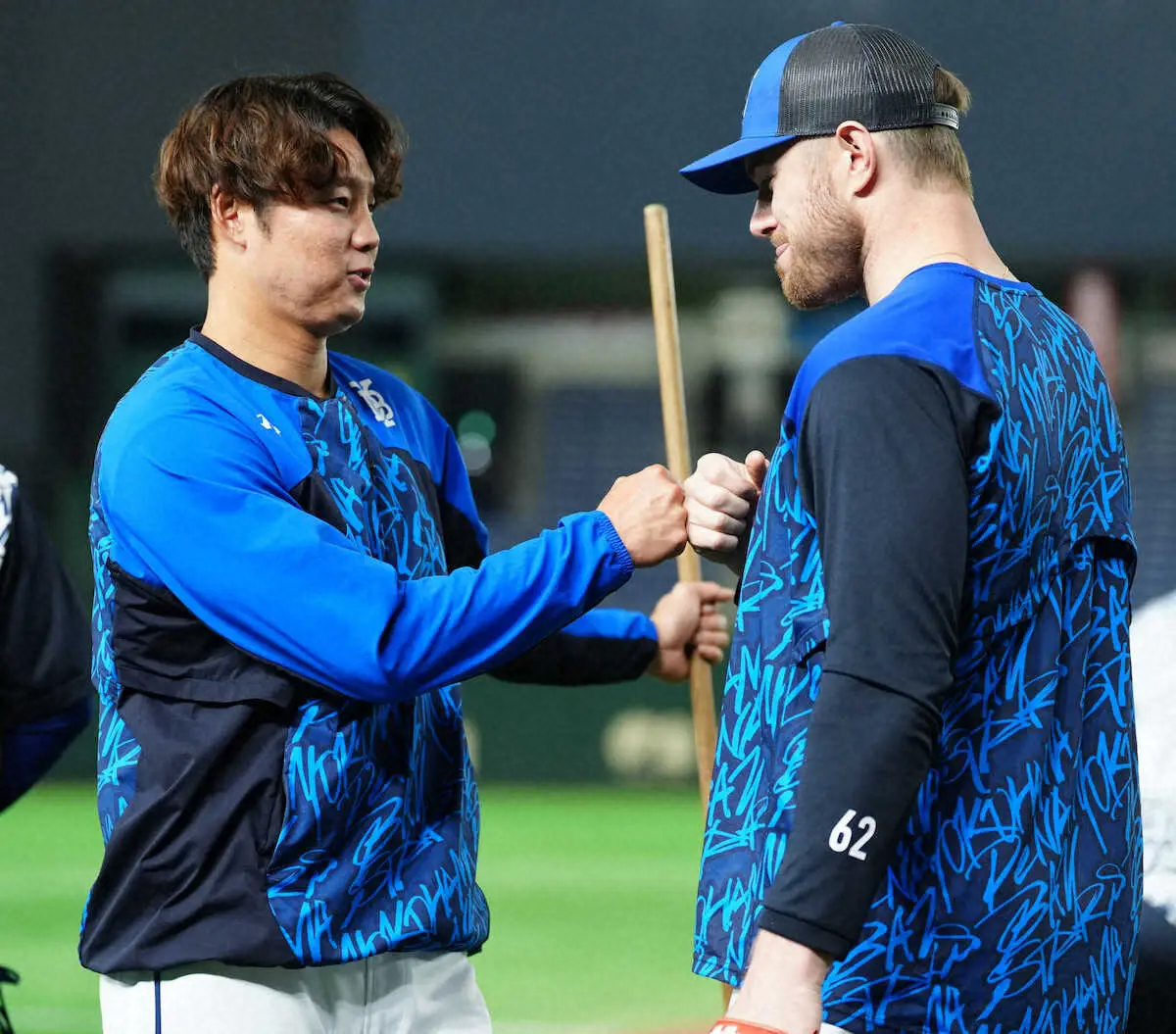 <巨・D(5)>ウィック(右)とグータッチする森原(撮影・島崎忠彦)