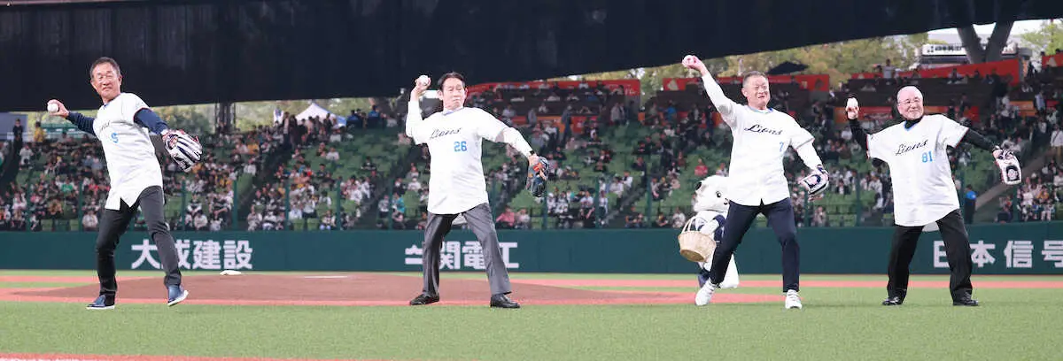 現役時代の背番号が入った「ライオンズ75周年ユニホーム」を着用。4人並んでボールを投じると、スタンドからは大歓声が起きた。