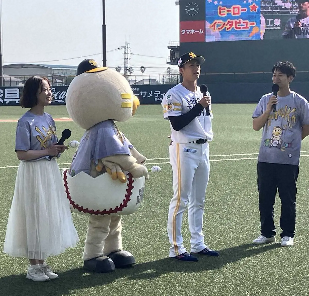 7回2安打無失点の好投でヒーローインタビューを受ける板東