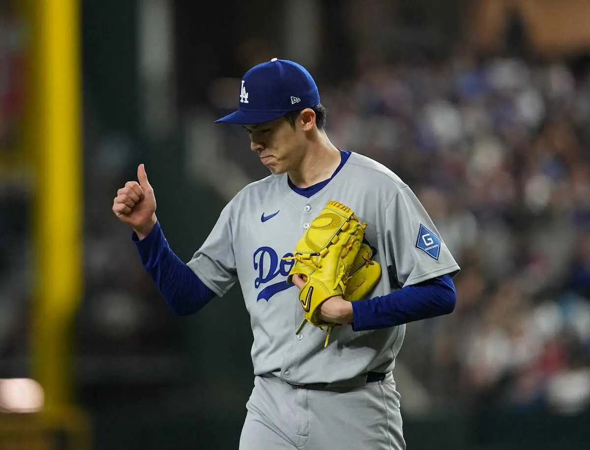<レンジャーズ・ドジャース>6回を無失点で切り抜け、サムアップポーズするドジャース先発・佐々木(撮影・沢田 明徳)