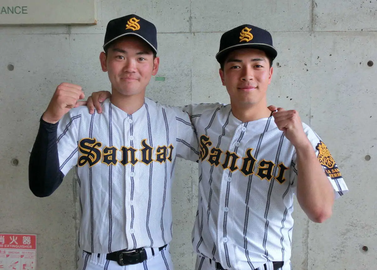 勝利に貢献した大阪産業大の投打のヒーロー、高橋投手(右)と大野内野手