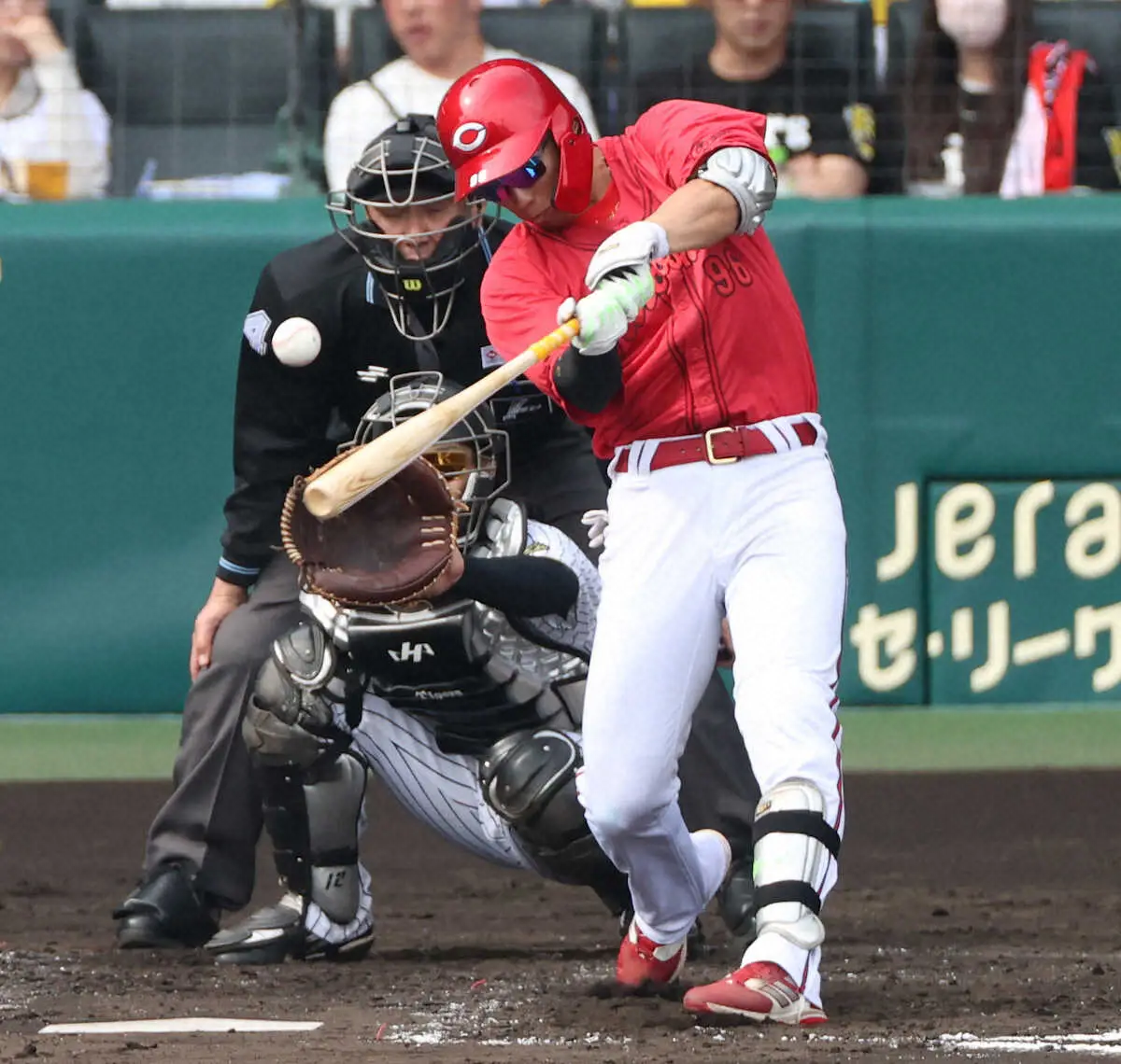 24年8月13日のDeNA戦以来、実に250日ぶりで、甲子園では初のマルチ安打。見守った新井監督は「奨成は、きょうヒット2本かな。良いアピールをしてくれていると思う」と目を細めた。
