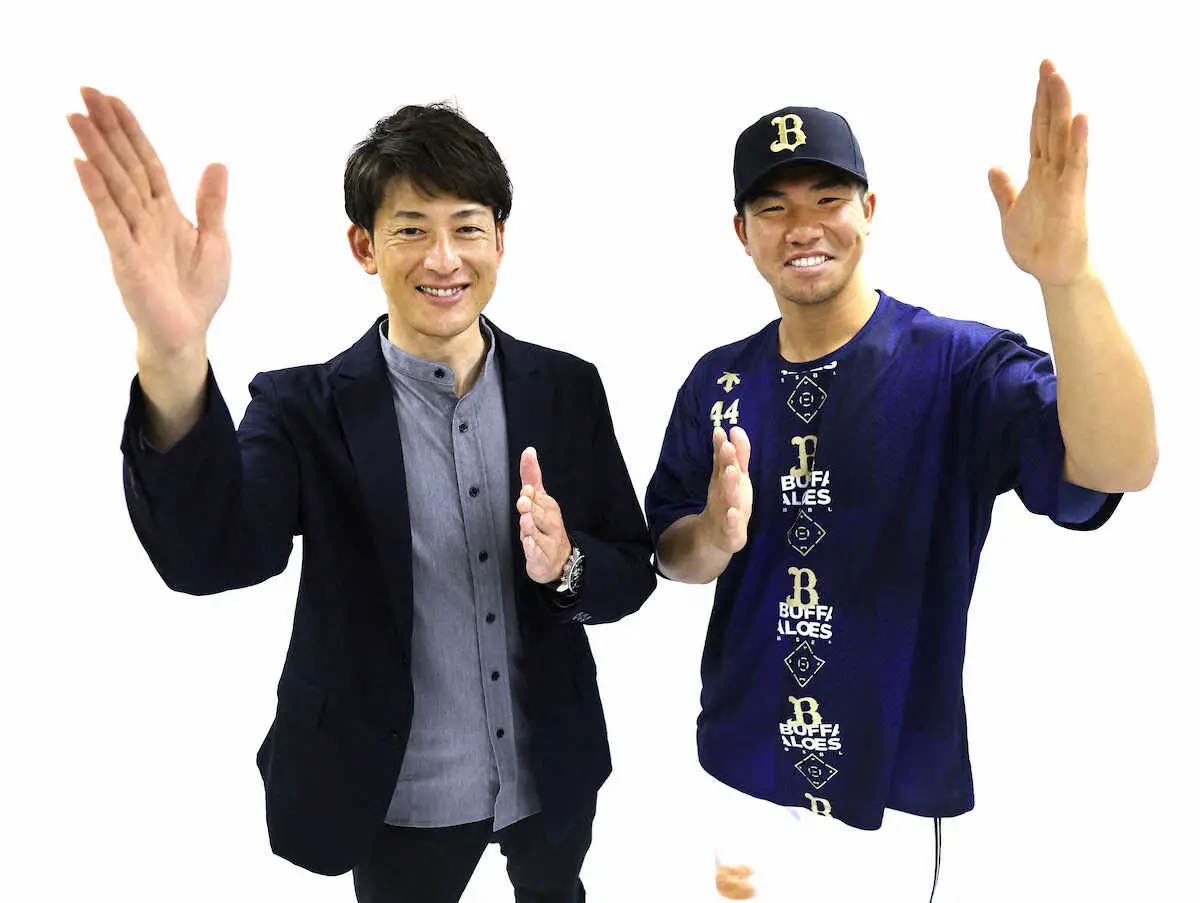 好調オリックスを引っ張るキャプテンの頓宮(右)とポーズをとる能見篤史氏(撮影・長嶋 久樹)