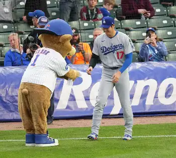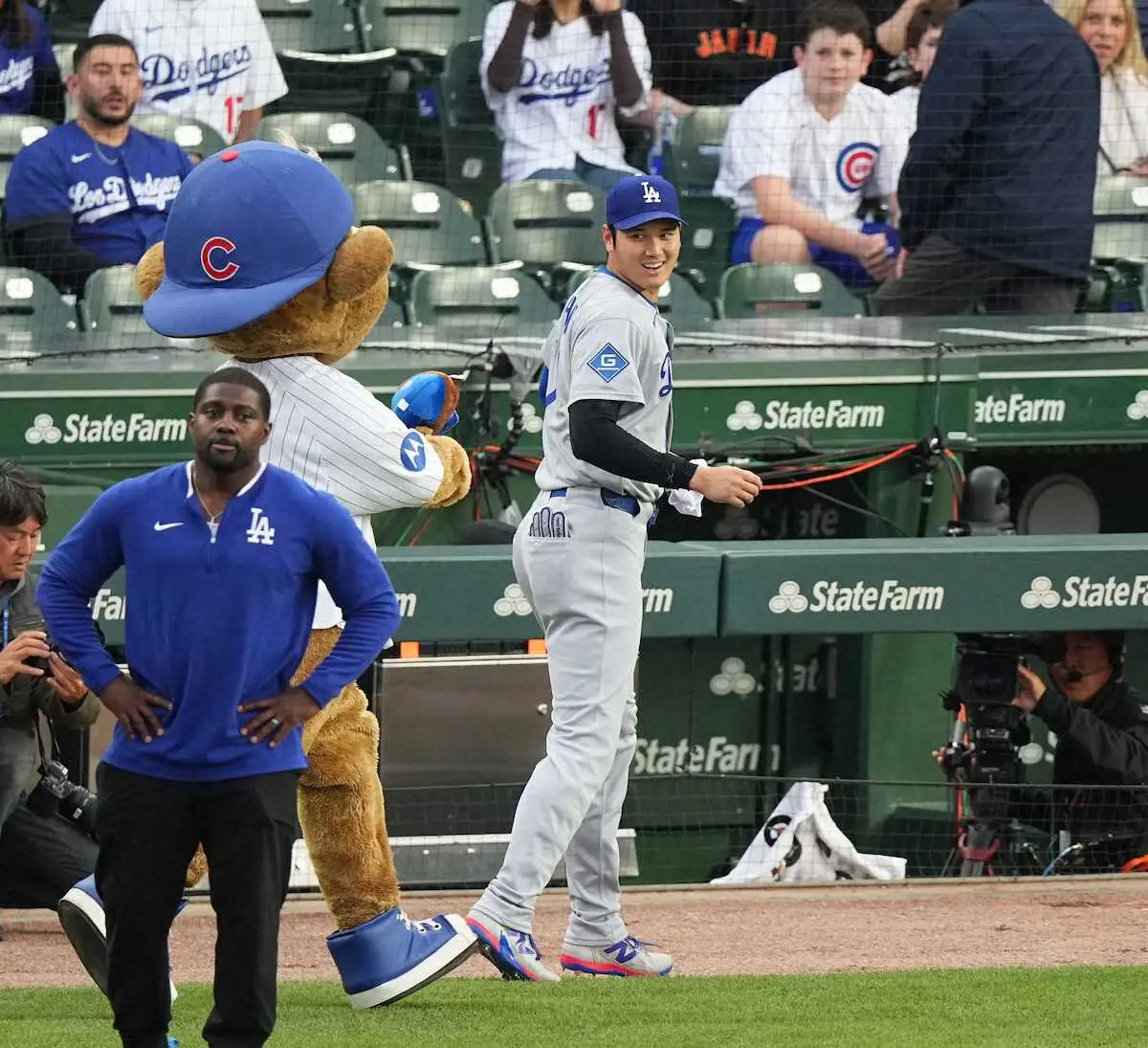 シカゴでも大谷は祝福された。試合前のウオーミングアップ中。近づいてきたカブスのマスコット・クラークから小さなぬいぐるみを手渡された。長女誕生の出産祝いとみられ、両手で受け取って満面の笑みで感謝した。