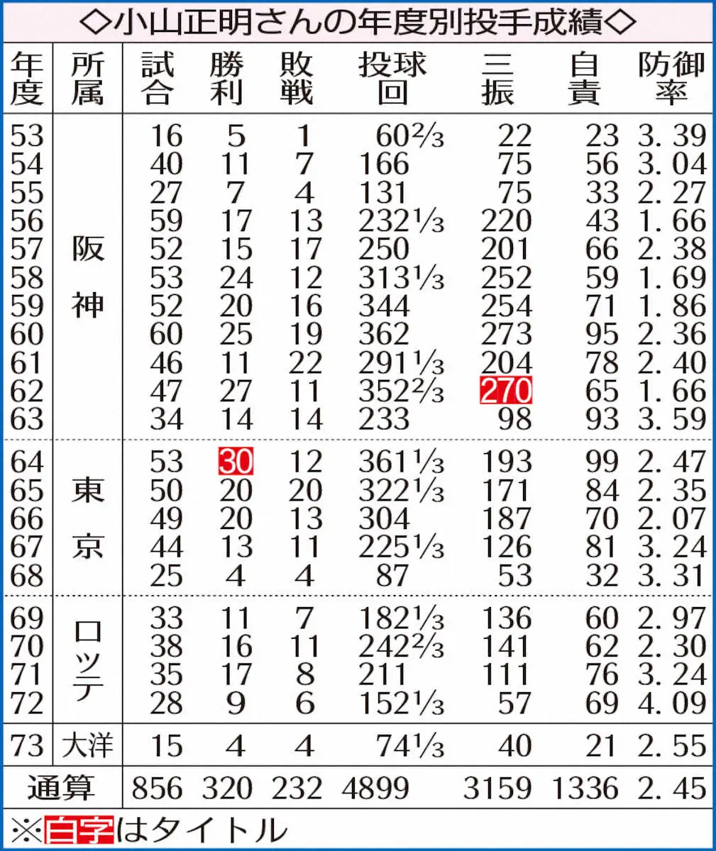 プロ野球、通算300勝以上の投手 Photo by スポニチ 元阪神・小山正明さん死去 歴代3位320勝の「精密機械」 球団90周年、吉… ギャラリーで見る この記事のフォト 2025年04月25日の画像一覧 もっと見る 2025年04月25日の画像をもっと見る