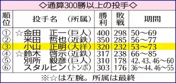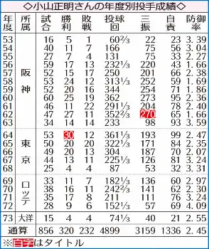 小山 正明(こやま・まさあき)1934年(昭9)7月28日生まれ、兵庫県出身。53年、高砂高からテスト生として阪神に入団。62年にはセ記録の5試合連続完封を含む27勝でリーグVに貢献し、沢村賞も受賞。63年オフに山内一弘との“世紀のトレード”で東京(現ロッテ)へ移籍。64年に30勝で最多勝。73年に大洋へ移籍し、同年限りで引退。通算320勝はプロ野球歴代3位。2001年に野球殿堂入り。現役時は1メートル83、73キロ。右投げ右打ち。