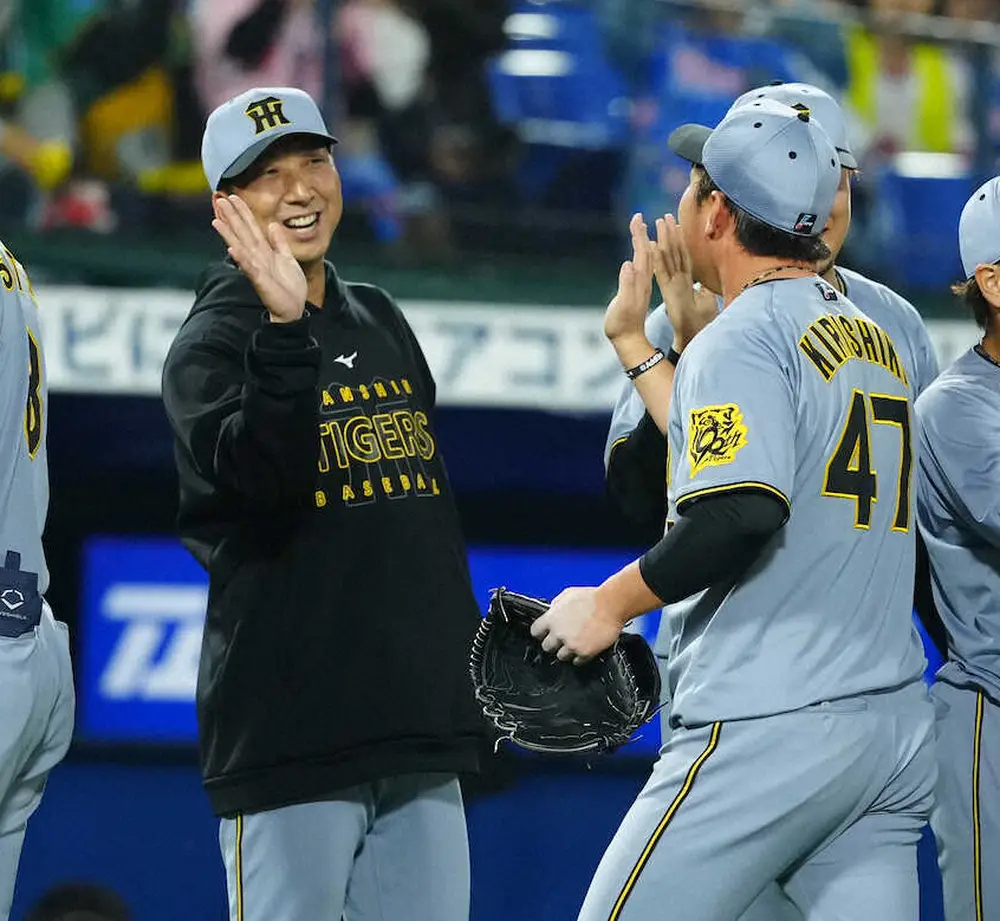 <D・神>桐敷(右)とハイタッチする藤川監督(撮影・島崎 忠彦)