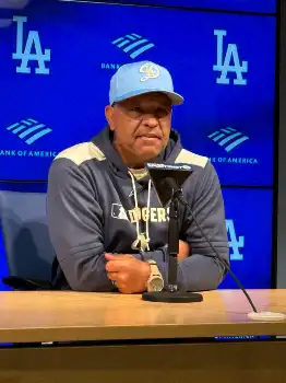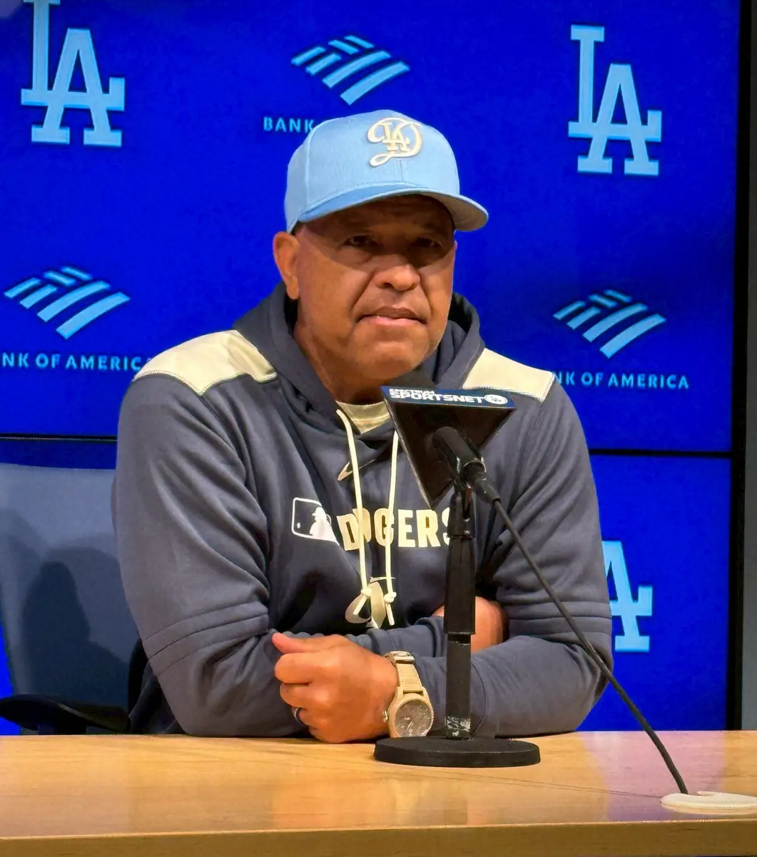 試合前、取材に応じるドジャース・ロバーツ監督(撮影・奥田 秀樹通信員)