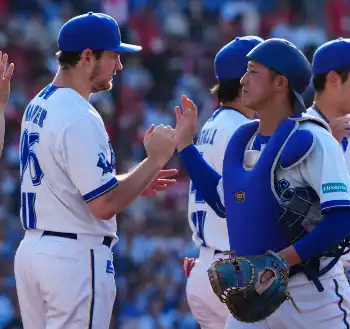 背番号96が吠えた。1点リードの8回1死三塁。一打同点のピンチで、バウアーはナックルカーブを3球続けて田村を空振り三振。続く羽月はこの日最速タイの153キロ直球を織り交ぜ、来日最多の129球目に再びナックルカーブで空振り三振に斬った。