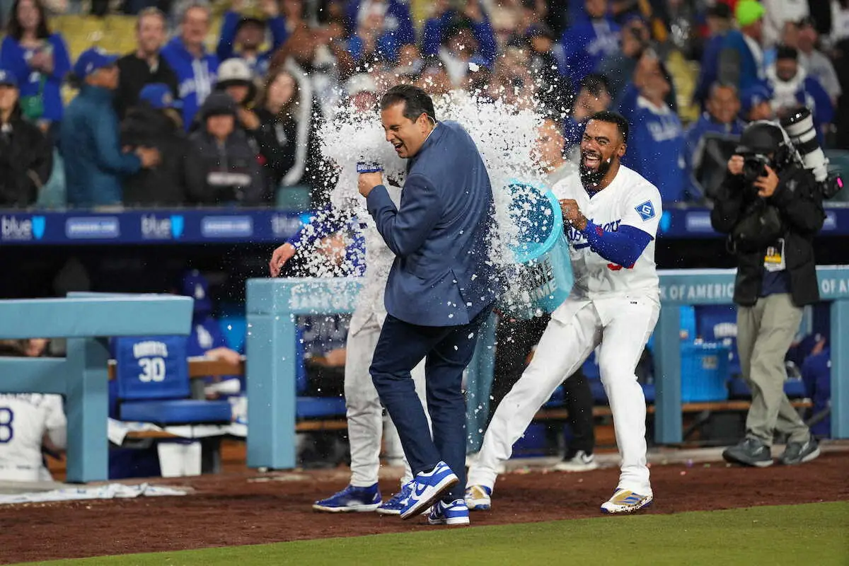エドマンのインタビュー中にはT・ヘルナンデスが飲み物が入った入れ物を持ってエドマンにかけようとしたが、まさかの「MLBネットワーク」でリポーターを務めるデビッド・ヴァセイ氏にほとんどかかるという“失態”。スーツ姿でびしょ濡れとなったヴァセイ氏だったが「外したぞ」と大笑い。エドマンも「外したぞ」と2人で笑い合った。