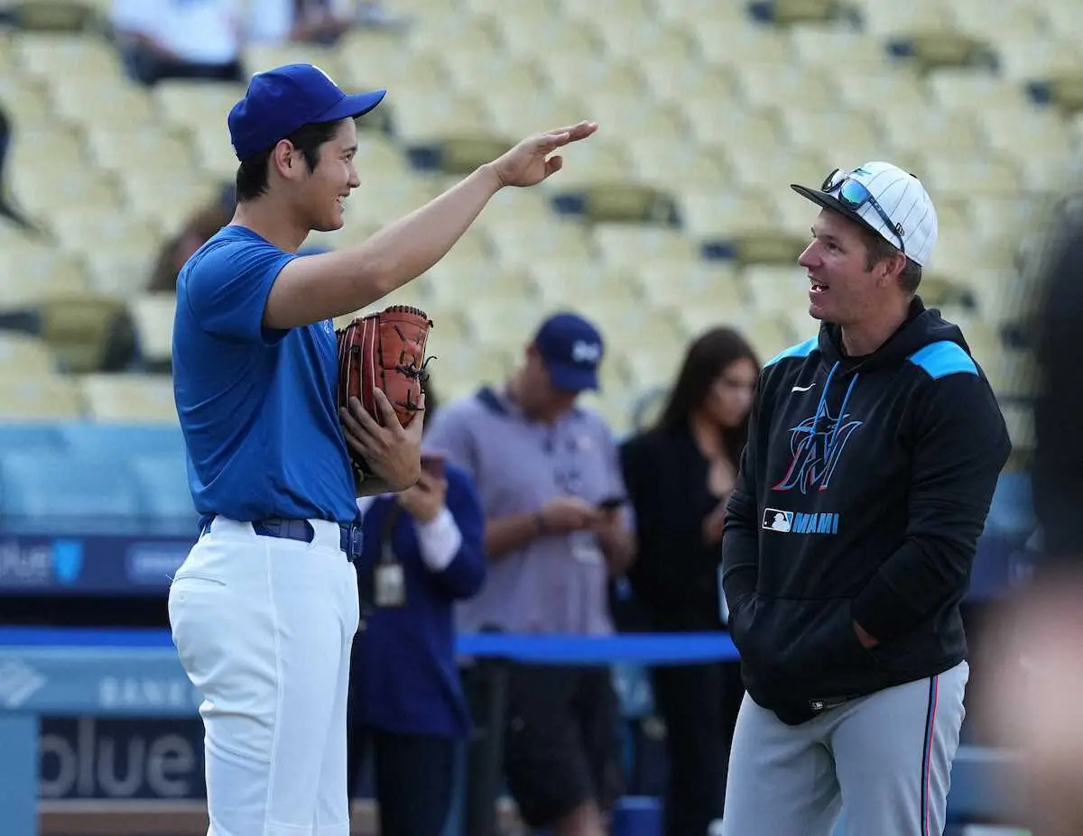 マーリンズのクレイトン・マッカラー監督は昨季までドジャース一塁コーチを務め、大谷の自己最多59盗塁に貢献。「ヘッドバンプ」は元々、同監督と始めたパフォーマンスで、2人で映像を見ながら相手投手の癖を分析する姿は日常だった。試合前には同監督へのチャンピオンリング贈呈も行われ、大谷も笑顔を見せていた。