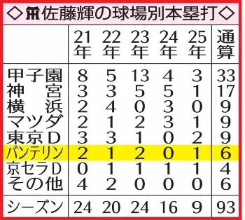 ○…佐藤輝(神)のバンテリンドームでの本塁打は23年9月25日以来2年ぶりで、通算6本はセ・リーグの本拠地球場では最も少ない。これでシーズン9号とし、新人から5年連続の2桁本塁打にリーチ。達成すれば阪神選手では岡田彰布の12年、田淵幸一の10年に続く3人目になる。なお佐藤輝の最速10号到達は新人の21年、チーム33試合目。目下チーム25試合目で、自己最速の更新もかかっている。