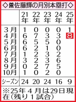 ○…9本塁打のうち4月に8本。月間8本塁打は22年4月の23年9月の7本を上回る自己最多となった。仮にきょう30日に2本出て月間2桁本塁打達成なら、阪神では22年6月、大山の10本塁打以来になる。