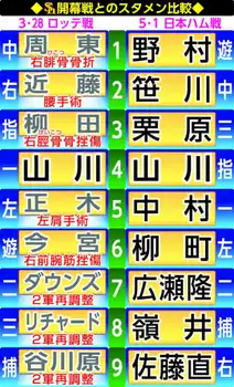 近藤、柳田、正木…。次々と主軸が抜け、開幕から球団記録の19試合連続安打を刻んだリードオフマンに加え、不動の遊撃手までがしばらく戦線離脱する。故障者だけではなく打撃不振もあり、開幕スタメンに名を連ねた野手9人のうち、8人が1軍から消えた。