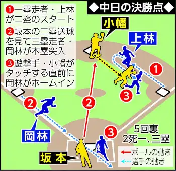 投打がかみ合わず、流れは次第に中日に傾いていく。象徴的だったのは同点の5回。2死一、三塁から重盗を仕掛けられ、二塁手前で一塁へ引き返した上林に遊撃手・小幡がタッチする直前に三塁走者・岡林に本塁生還を許した。