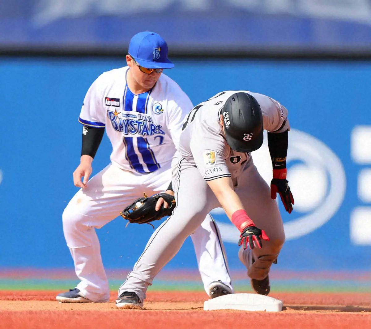 <D・巨>5回、左越えへ安打を放つも勢い余って二塁ベースを離れ、牧(左)にタッチされアウトとなる岡本(撮影・光山 貴大)
