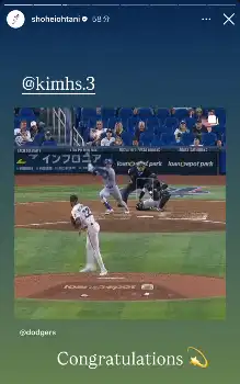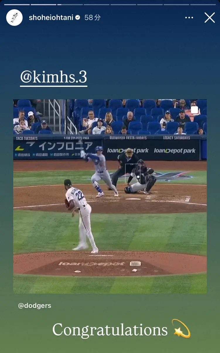 試合後、大谷はインスタグラムのストーリーズでキムのアカウントをメンション。ヒットを放つ動画を載せ「Congratulations」と祝福のメッセージを送った。