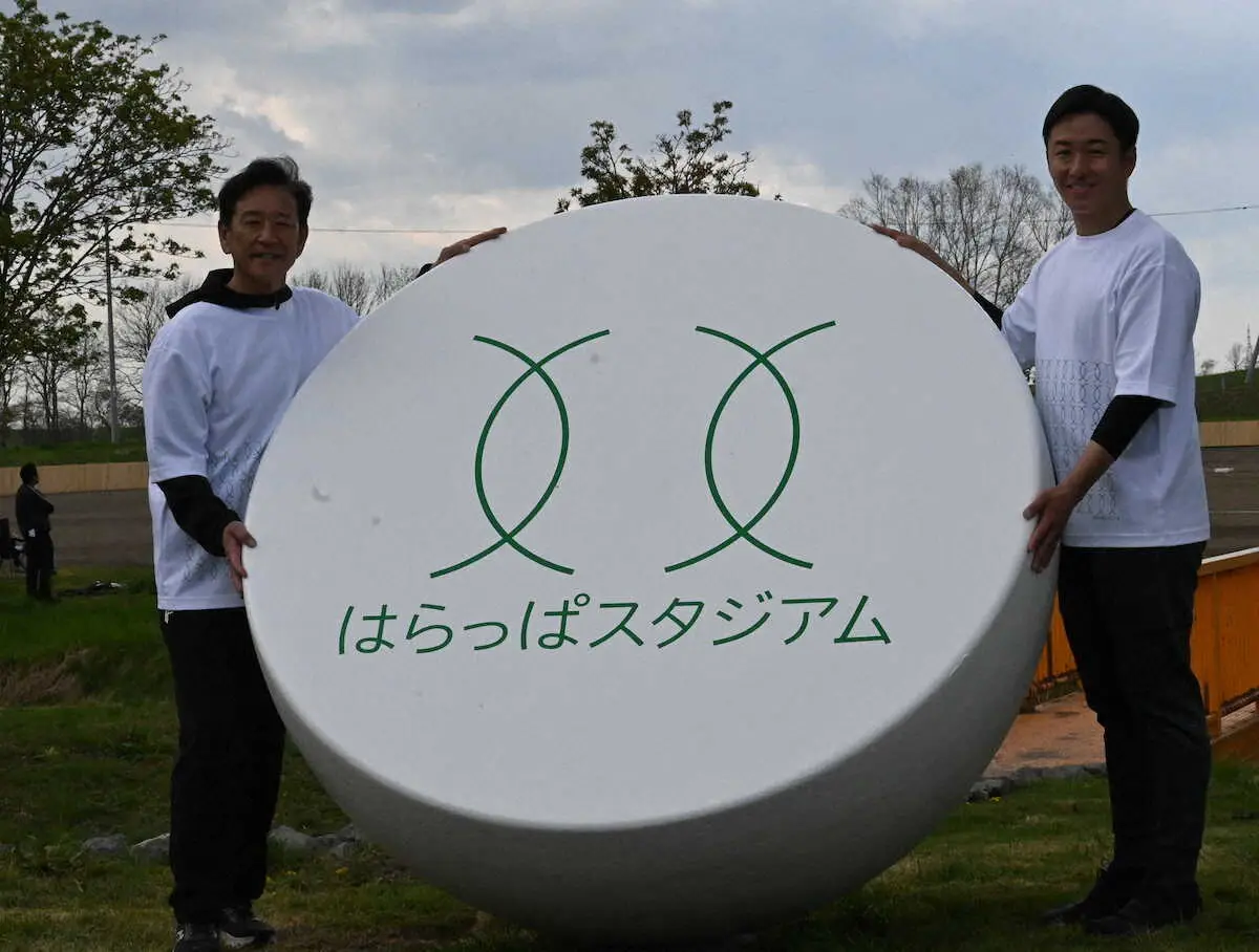 はらっぱスタジアムのモニュメントをお披露目する斎藤佑樹氏(右)とスペシャルゲストの日本ハム・栗山英樹CBO
