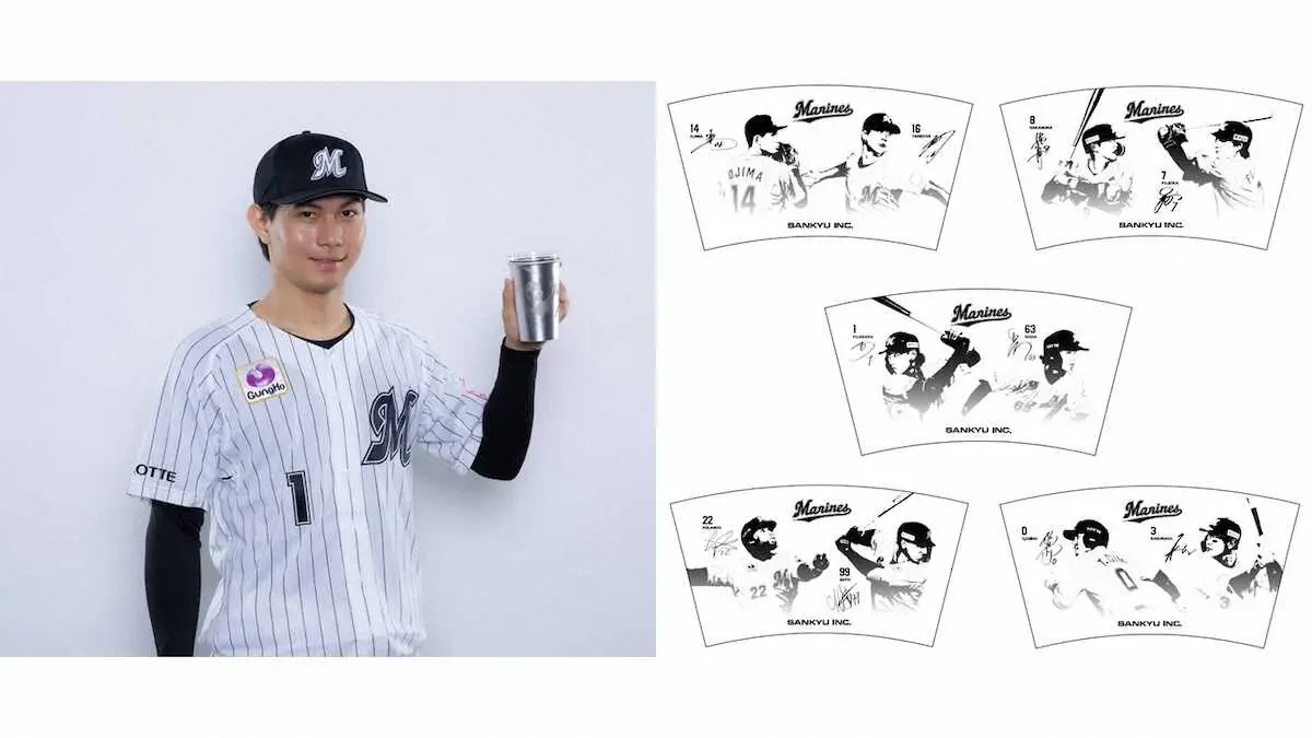 ビアカップタンブラーは、1カップに2選手が描かれたデザインを全5種類を用意。ZOZOマリンスタジアムで販売されているビールやソフトドリンクなどのドリンクカップを重ねて使用できるほか、そのままタンブラーとしても使用できる。また、飲み物を入れると温度に反応して選手のイラストがはっきりと現れるギミックが施されている。