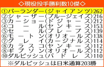 ◇ジャスティン・バーランダー 1983年2月20日生まれ、米バージニア州出身の42歳。オールド・ドミニオン大から2004年ドラフト1巡目(全体2位)でタイガース入団。11年に24勝5敗、防御率2.40、250三振で投手3冠に輝き、サイ・ヤング賞とシーズンMVPを受賞。アストロズ移籍後の19、22年にもサイ・ヤング賞。夫人はモデルのケイト・アップトン。通算3452回2/3、262勝、3448奪三振はいずれも現役最多。1メートル96、108キロ。右投げ右打ち。
