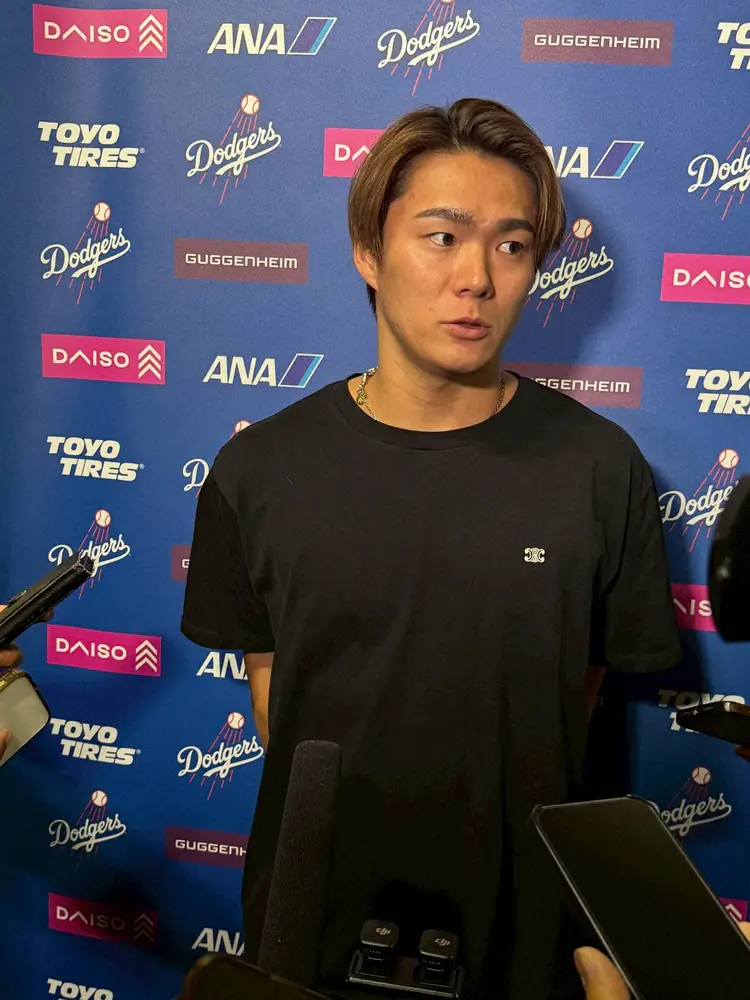 ダイヤモンドバックス戦後、取材に応じる山本由伸(撮影・奥田 秀樹通信員)